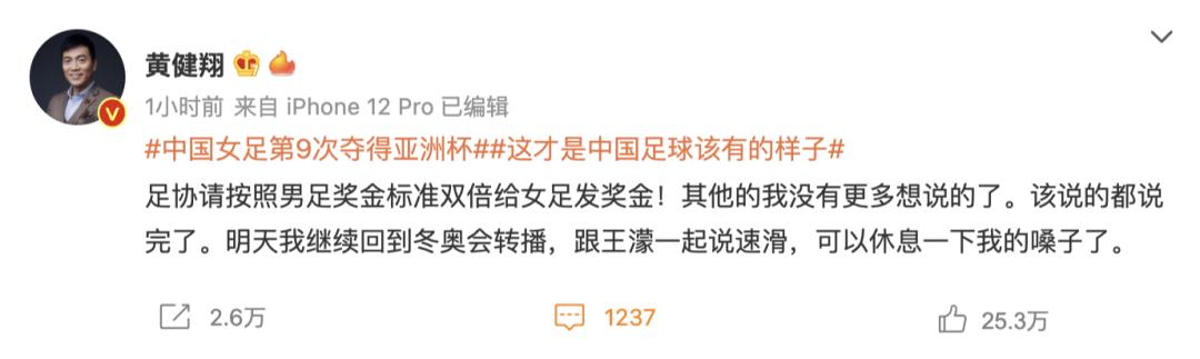 图自@人民日报黄健翔还在女足夺冠后发微博呼吁称,“请按照男足奖金标准双倍给女足发奖金,其他的没有什么想说的了,该说的都说了。