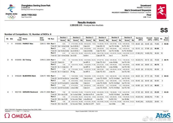 至于为什么加拿大裁判给苏翊鸣打低分,@人民体育 分析称,加拿大裁判是负责道具区打分,苏翊鸣在道具区的表现确实略有不足,因此被打低分。而在跳台部分,苏翊鸣的得分要高于获得金牌的帕洛特。我们只能说,尊重判罚,苏翊鸣已经表现的很棒了,最重要的是,才17岁的小鸣未来可期!