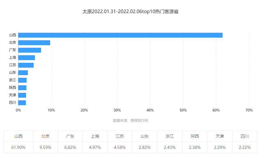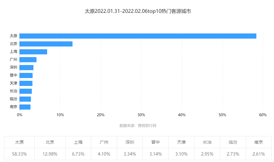 春节期间,中长途的省外游客占比46.63%,省内游客占比53.37%。从热门客源地来看,排名前五的客源省分别为山西、北京、广东、上海、江苏。其中,山西本省游客贡献近62%的旅游人次。排名前五的客源城市分别是太原、北京、上海、广州、深圳,五个热门客源城市贡献了近82.5%的旅游人次。