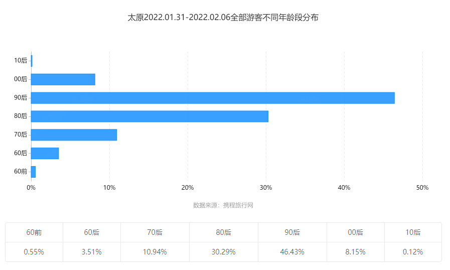 从游客年龄分布来看,90后占比最高,占比突破46%,80后占比30%左右。今年春节带娃出行更普遍,00、10后占比提升显著。