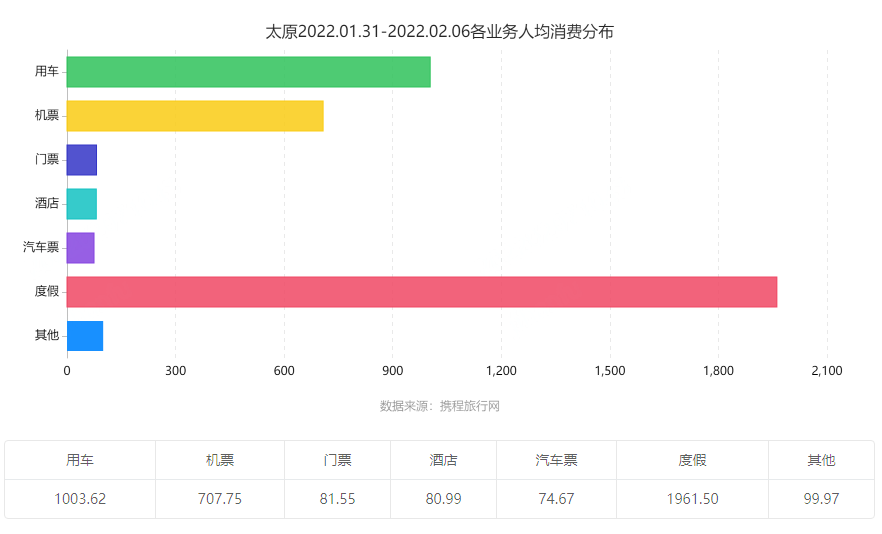从各业务人均消费来看,度假、用车及机票产品人均消费较高,用车业务人均消费1003元,比2021年春节增长46.8%,用车消费的迅速增长对应了今年春节“不出远门”“周边过年”的需求,机票消费也从人均583元提高至人均消费707元。