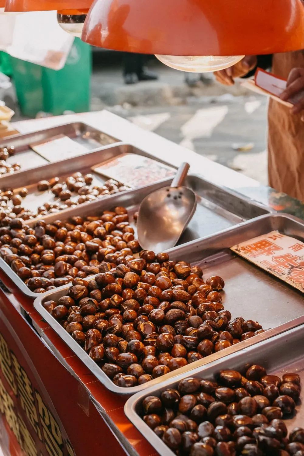 抿曲、蛋卷、烤肠、馄饨、爆米花、糖炒栗子、煎灌肠......个个炭火旺盛,热气蒸腾。