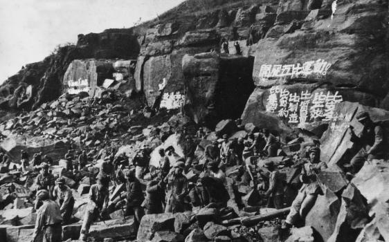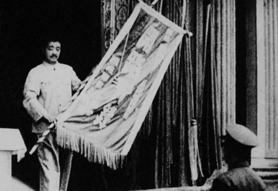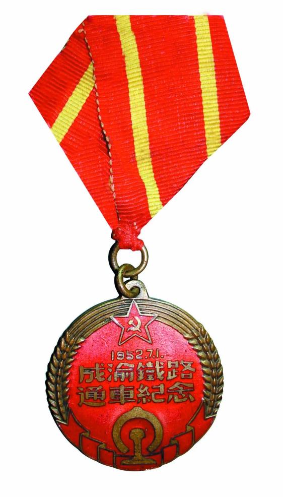 (铁道部部长滕代远将毛泽东题写的“庆贺成渝铁路通车,继续努力修筑天成路”授予成渝铁路建设者)