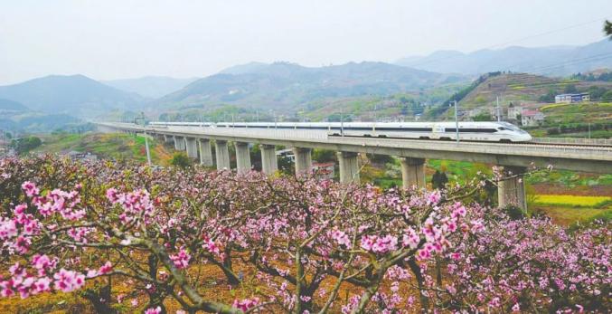 (动车组列车运行在鲜花掩映的成渝高铁上。摄影@曹宁)