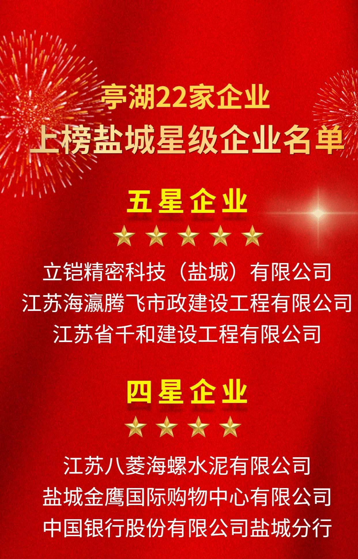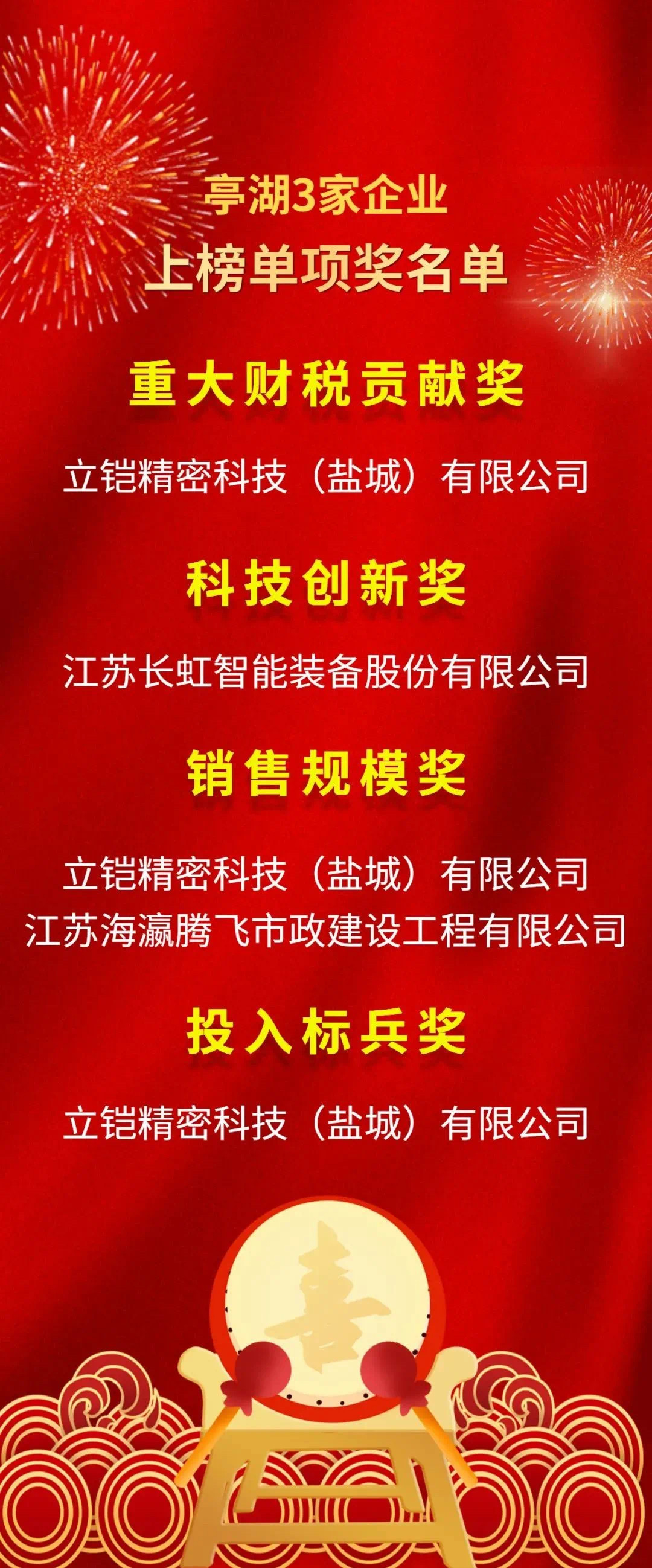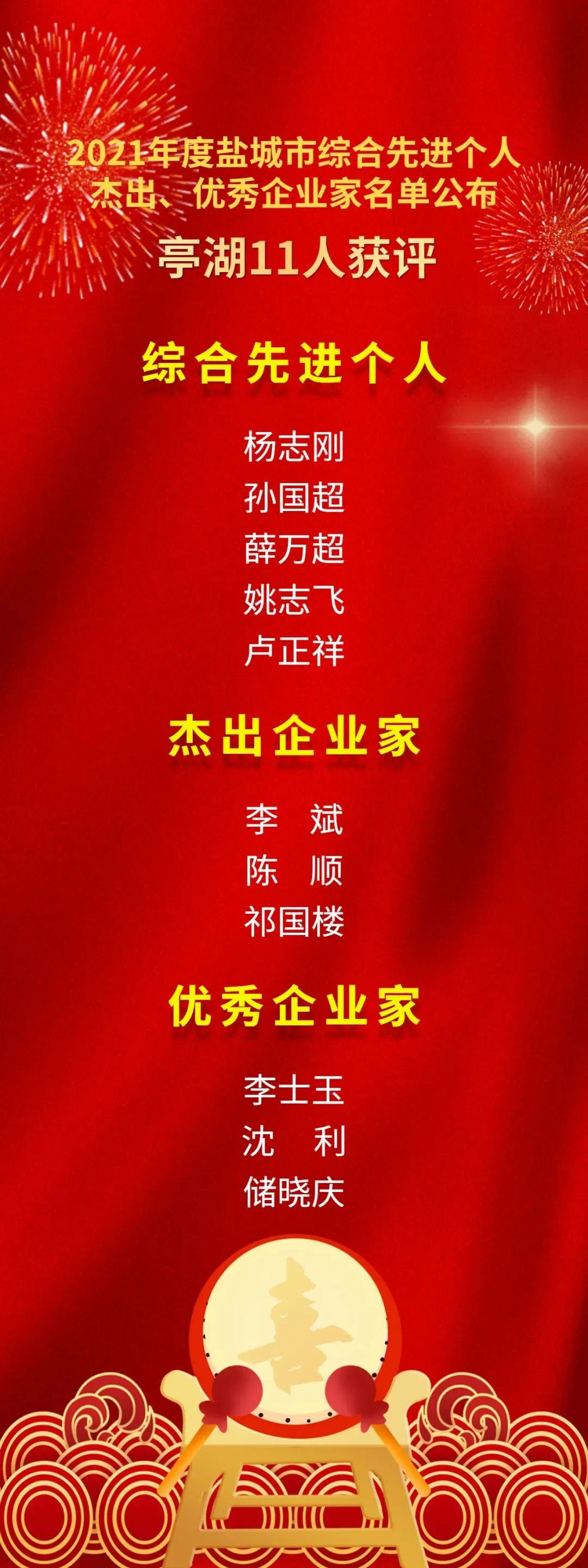 2月7日上午,从2021年度江苏省盐城市综合考核总结表彰大会上传来喜讯,亭湖区荣获全市综合考核第一等次,获重大项目推进单项奖。同时,盐城环保科技城(亭湖经济开发区)等10家园区上榜全市开发园区“等级创建”,立铠精密科技(盐城)有限公司等22家企业上榜星级企业,杨志刚等5名同志获综合先进个人奖,李斌等6名企业家分别获评杰出、优秀企业家。
