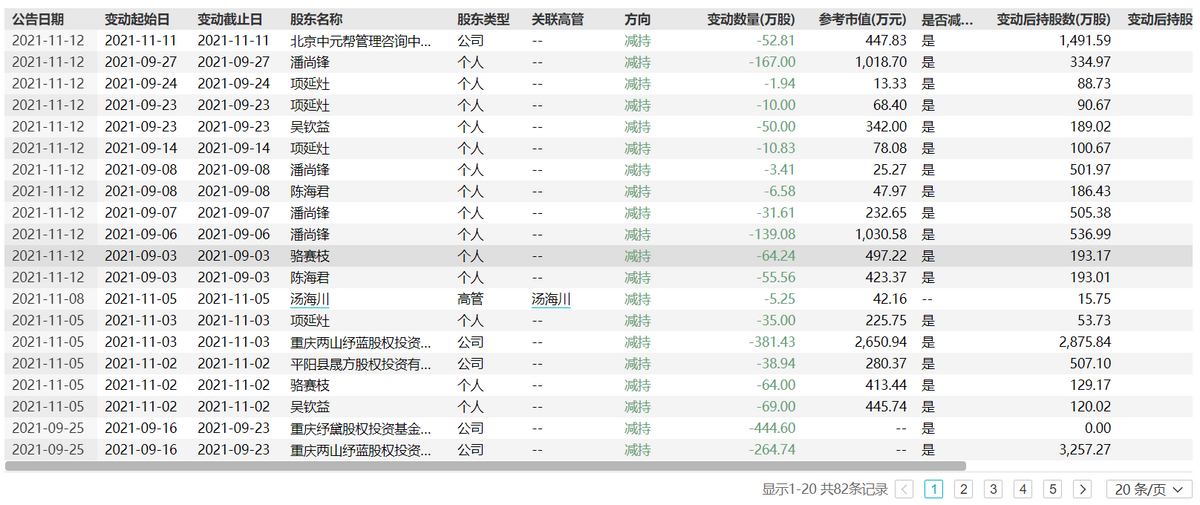 图源:蓝黛科技公告Wind数据显示,2021年1月25日-2022年1月25日,蓝黛科技共计出现54次减持,共计减持7311.07万股。减持的股东主要为重庆纾黛股权投资基金合伙企业(有限合伙)、重庆两山纾蓝股权投资基金合伙企业(有限合伙)、浙江晟方投资有限公司。