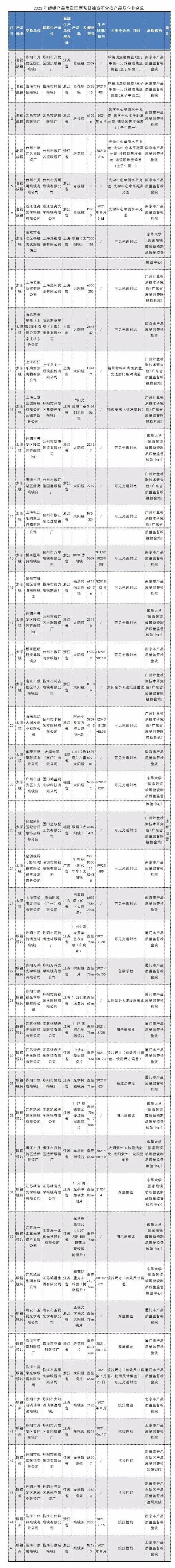 老视成镜(老花镜)6批次产品不合格,不合格发现率为6.6%。标称生产单位涉及: