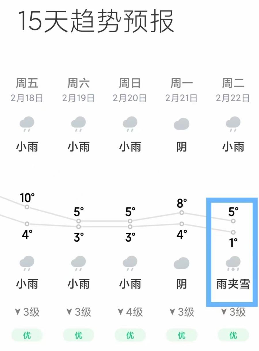 “22日有雨夹雪,23日1-5℃......”