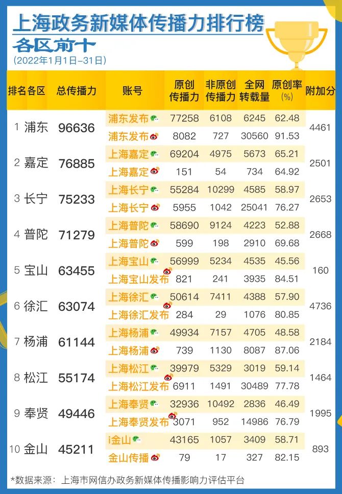 1月,上海市政务新媒体两微发稿总量达51120篇,其中政务微信发稿量16177篇,政务微博发稿量34943篇。两微原创稿件共35878篇,原创率70.2%,比上月增长2.6个百分比。区级榜单中,长宁区、奉贤区结合中心工作,加强内容供给,排名进步明显。委办局和人民团体榜单中,市人社局、市民政局贴近民生,服务民生,内容发布传播力影响力有效提升。