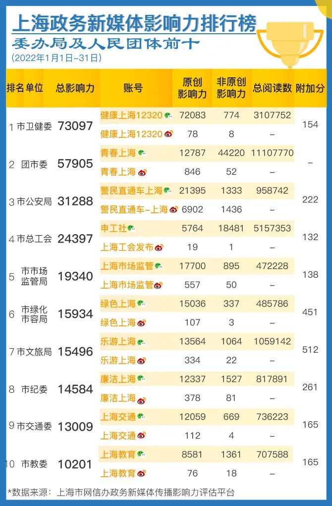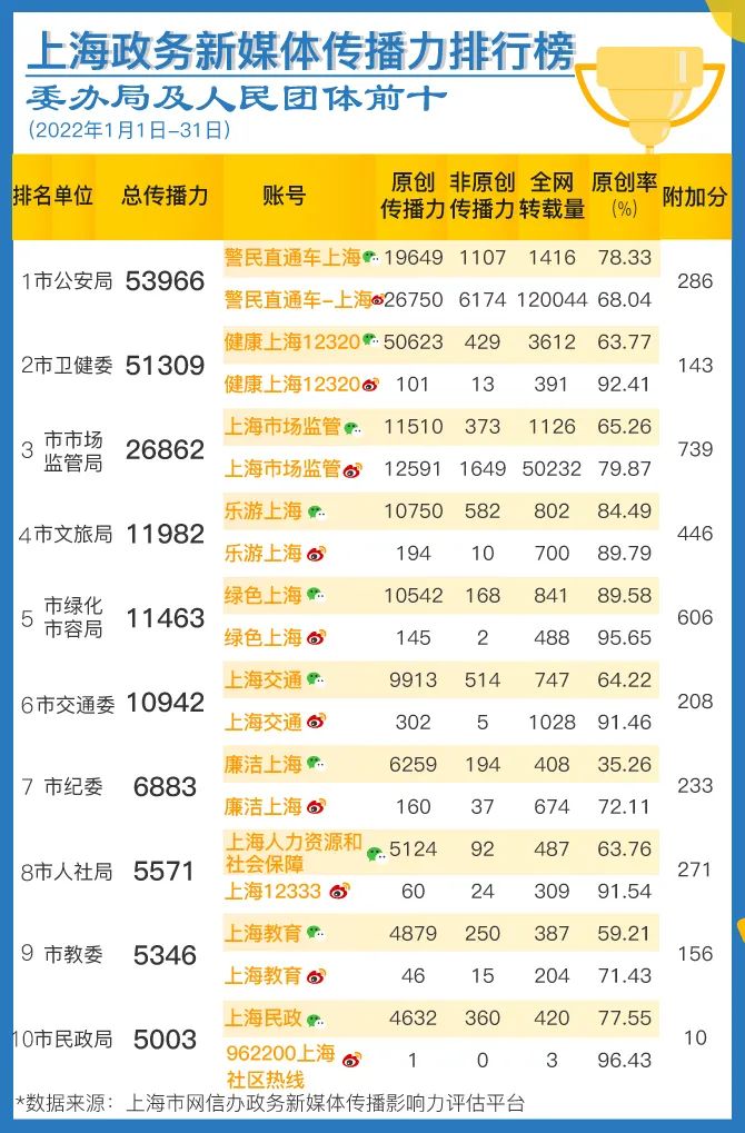 榜单由上海市委网信办与上海市政府新闻办公室联合发布。数据来源于上海市委网信办自主研发的“政务新媒体传播影响力评估平台”,目前该平台覆盖全网各渠道,纳入了276个新闻客户端、251家新闻网站、1200万微信公众号、3亿多微博账号的数据。