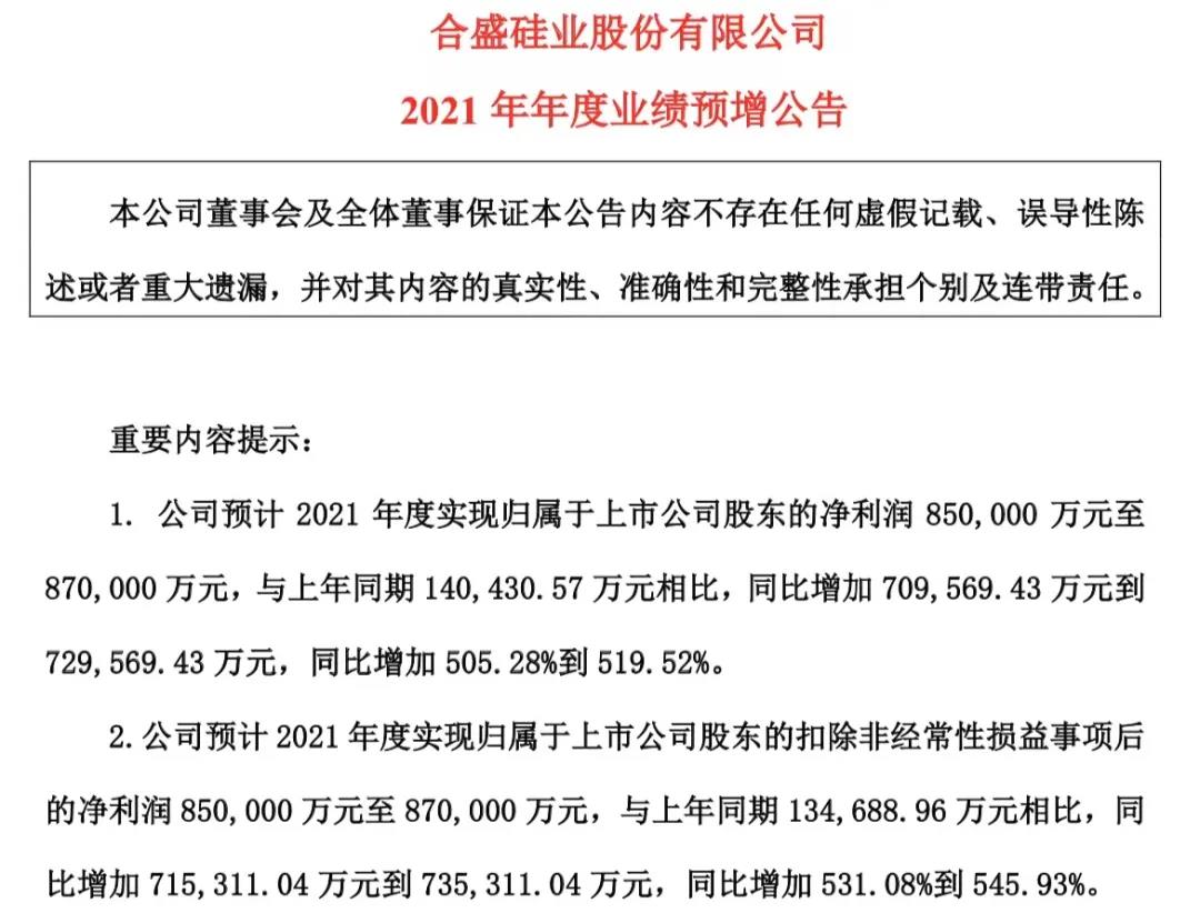硅料涨价潮背景下,硅料厂商“躺赚”已经是不争的事实。作为国内罕有的有机硅、工业硅双龙头,合盛硅业具备国内最为完整的硅产业链条、最大的生产规模。1月11日晚,合盛硅业披露业绩预告,2021年公司预计实现归母净利润85亿元至87亿元,同比增长505.28%至519.52%,扣非净利润85亿元至87亿元,同比增长531.08%至545.93%。在目前已发布业绩预告的53家光伏企业中,合盛硅业的盈利数额及涨幅均位列榜首。