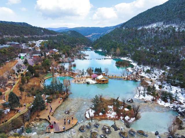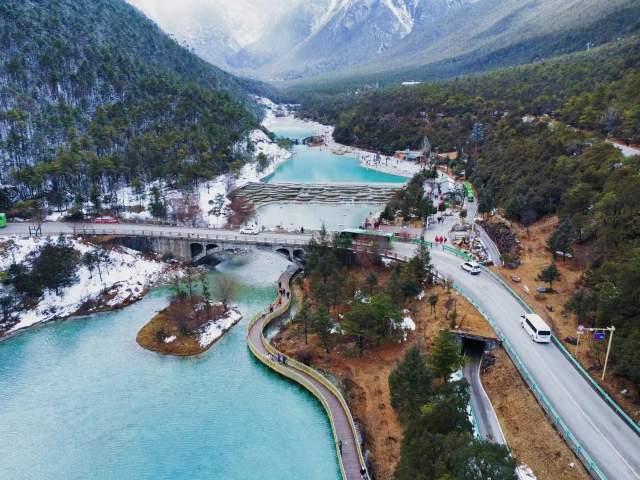 高空俯视蓝月谷 犹似雪山镶嵌了一弯蓝月亮