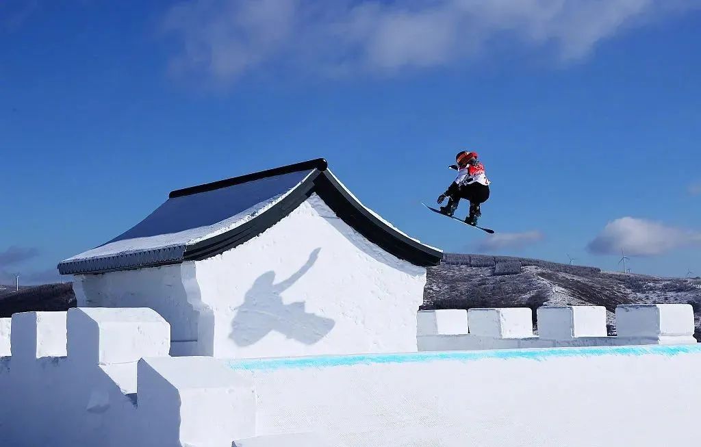 就在大家为苏翊鸣欢呼的时候不少观众注意到他飞檐走壁的身影下是万里长城造型的坡道