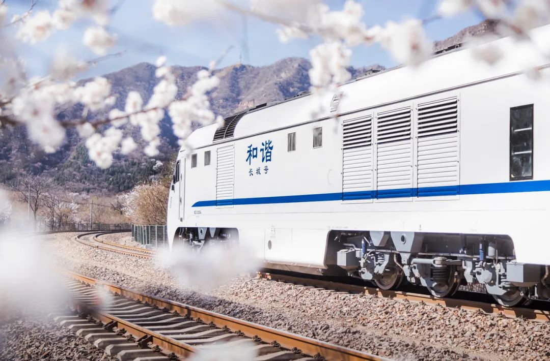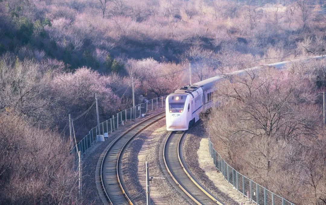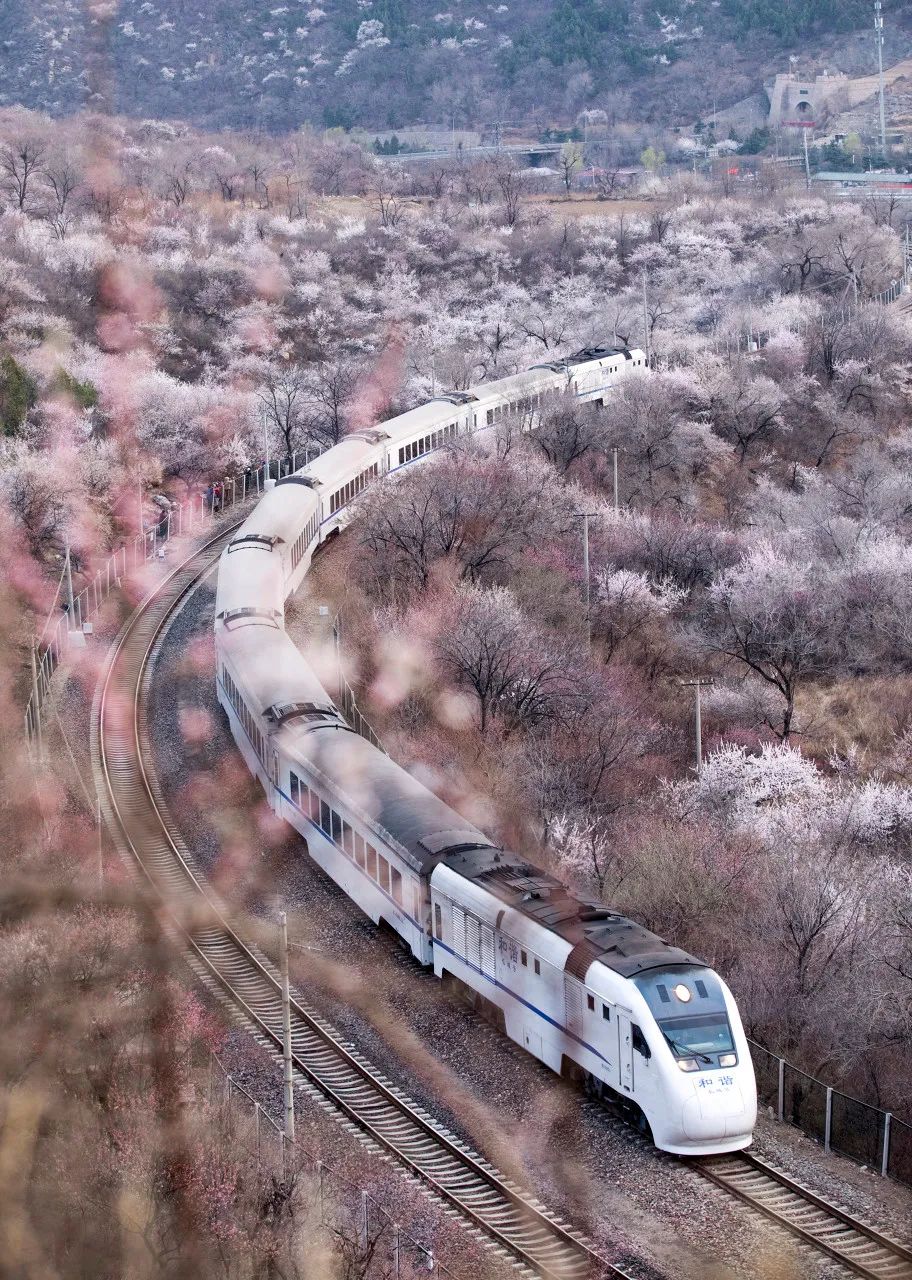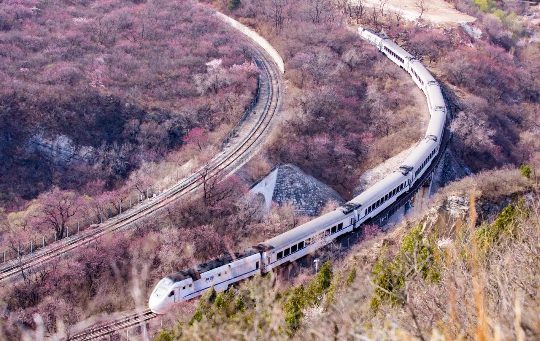 它在长城脚下穿梭途径的居庸关长城两旁满山的樱花、桃花盛放粉若云霞,让人难忘