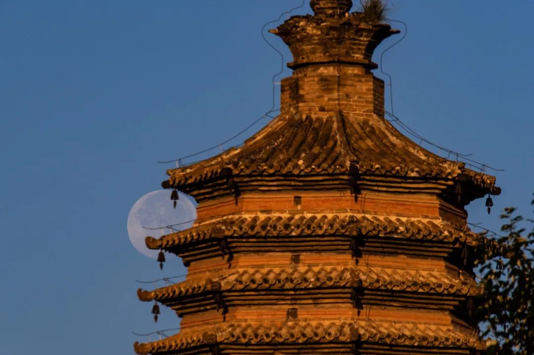 每层四正面中间都镶嵌铜镜一面阳光照耀金光闪闪
