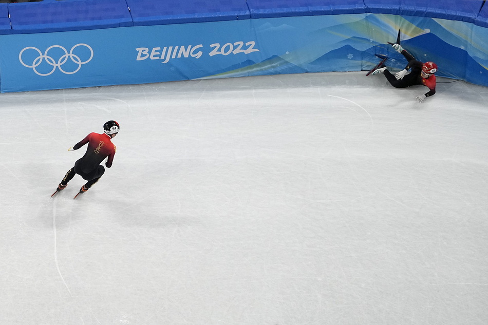 比赛中,中国选手李文龙与加拿大选手冰刀磕碰后摔出冰面,但中国队并没有因此放弃。此刻,任子威与摔倒的李文龙击掌后,奋起直追!中国选手永不言弃的精神瞬间冲上热搜榜第一,网友们纷纷点赞。