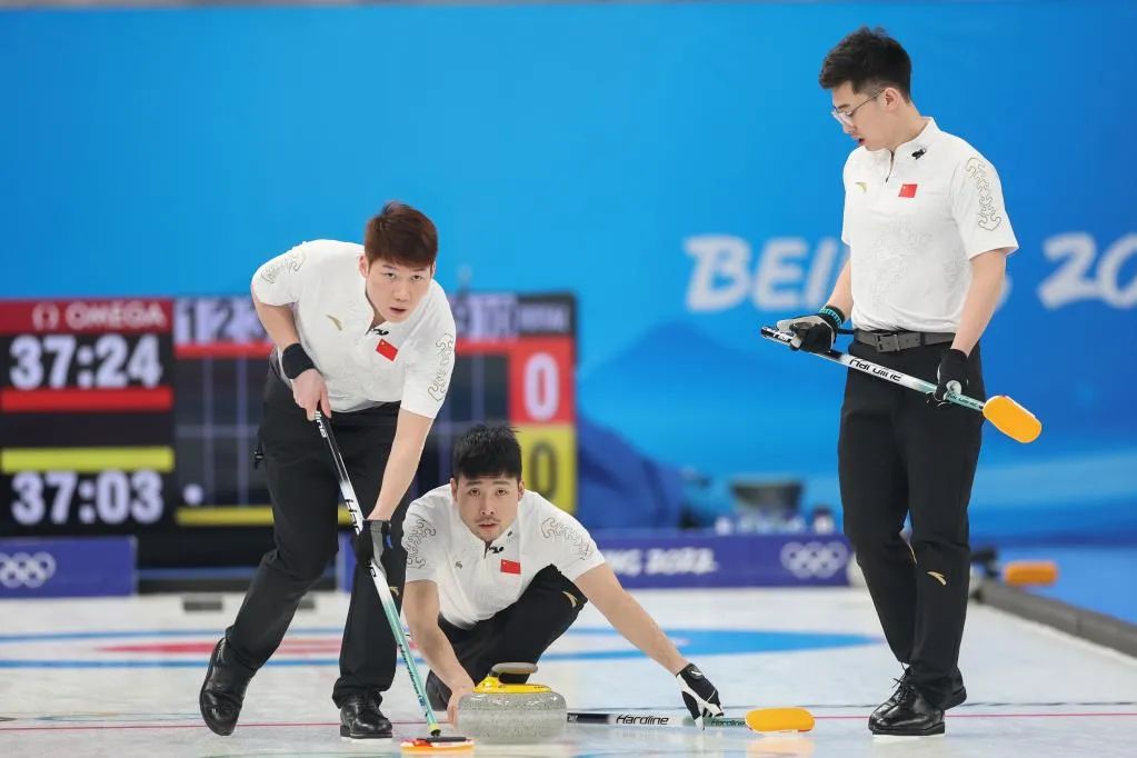 2月11日,中国队选手王智宇、邹强、许静韬(从左至右)在北京2022年冬奥会冰壶男子循环赛中。(图片来源:新华社)