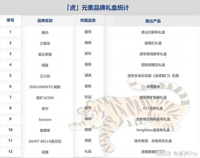 据《新声Pro》统计,包括蕉内、三顿半、霸王茶姬 、观夏 、江小白、DOCUMENTS 闻献、元气森林旗下品牌有矿UCON、李宁、Seesaw、星期零 、SAINT BELLA圣贝拉、花糖在内的12家品牌将虎作为主要灵感,进行春节产品更新以及推出限定礼盒。