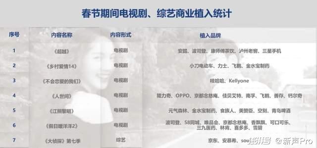 据《新声Pro》统计,春节期间热播的电视剧及综艺,都迎来了大批消费品牌的植入与合作。