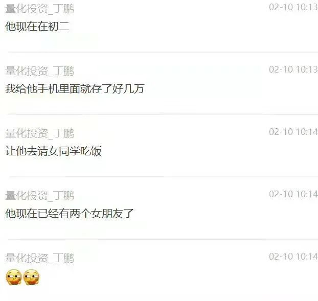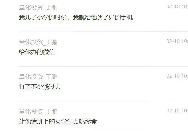 网传对话内容显示,在谈到教育孩子问题时,丁鹏表示:“我儿子小学的时候,我就给他买了好的手机,给他办的微信,打了不少钱过去,让他请班上的女学生去吃零食。”