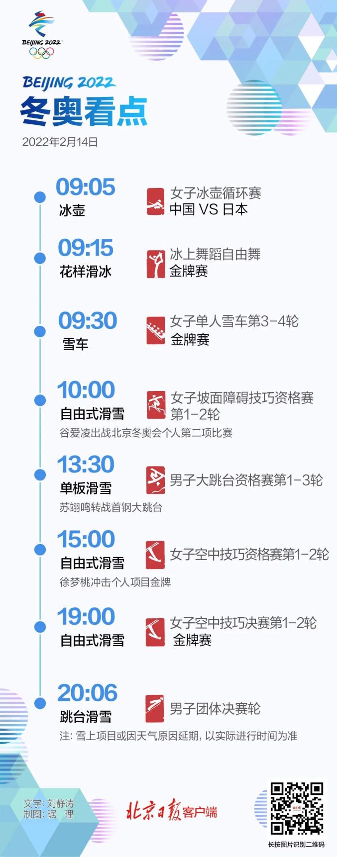 2月14日全部赛程如下:冰壶: