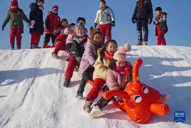 孩子们在流平寺冰雪乐园参与冰雪运动。(毕瑞翔摄)坐进雪圈里,顺着滑溜溜的雪道飞驰而下,接近终点时,雪圈飞离地面,并落在充气垫子上。这种风驰电掣的感觉,让张洋直呼:“刺激、好玩!”