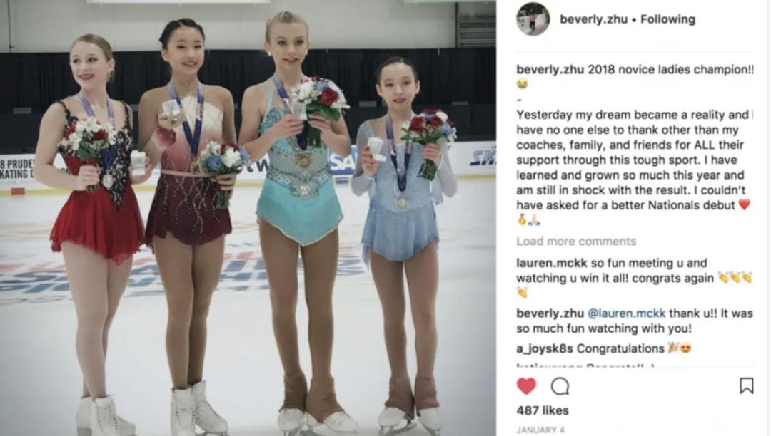 朱易(左二)获得美国锦标赛新人组的冠军9年的时间,朱易每天保持4节上冰课,以及辅助练习和芭蕾等艰苦训练。