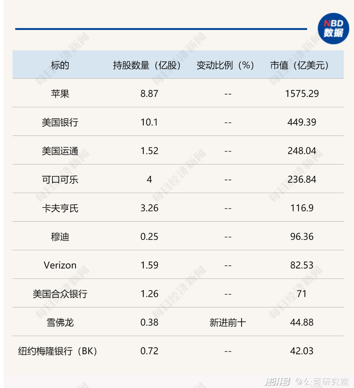 前十大重仓股:前十大重仓股集中度为89.54%。第一大重仓股仍然是苹果公司,持仓数量维持8.87亿股、市值1575.29亿美元,占披露持仓总规模的47.6%。第二到第五大重仓股依然是美国银行、美国运通、可口可乐和卡夫亨氏,持股数量分别为10.1亿股、1.52亿股、4亿股和3.26亿股,市值分别为449.39亿美元、248.04亿美元、236.84亿美元和116.9亿美元。
