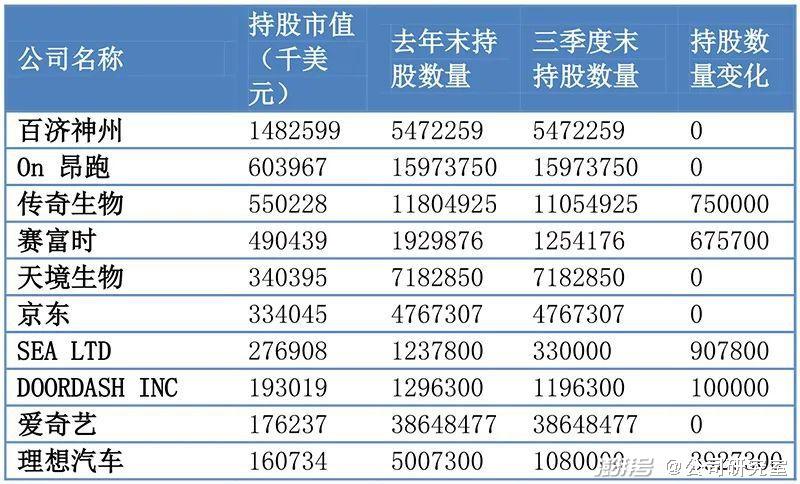 前十大重仓股依次为:百济神州、昂跑(ON HOLDING)、传奇生物(Legend Biotech)、赛富时、天境生物、京东、SEA、DoorDash、爱奇艺、理想汽车。总起来看,6只中概股,其余4家公司为海外企业。