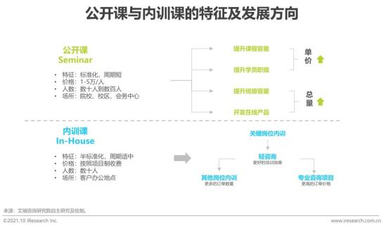 公开课是培训组织最基本的经营模式,主要指培训组织根据市场调研发现行业热点问题、研发相应的培训课程并组织学员集中授课的模式。公开课以线下面授为主,授课场所多在院校教室、机构校区或酒店会务中心,课程标准化程度高,课程的单价较低,培训周期较短(3-4天),属于扩大市场规模的产品,可通过提升受训人数、提高受训人群职级与提供体系化长期课程来提升单位客户的采购金额,进而优化产品的毛利率。内训课模式主要指公司应客户的要求,派出公司内训师前往客户内部,为客户指定的管理人员提供企业管理培训服务,它通常是针对特定客户提供的培训服务。内训产品多为半标准品,受训人数相对较少,讲师与学员互动更加频繁,教学设计也更加丰富,讲师会基于客户企业受训人群的具体培训需求对课程进行相应调整,并将轻咨询融入培训的过程当中,解决学员在实际工作当中的具体问题。相较于公开课而言,因内训课交付过程中的人力投入更大,且多基于项目进行整体报价,毛利率小幅低于公开课,因此内训产品的定位是提升其他内训课程的续费率或者向更重的咨询项目转化,以实现在保持毛利率稳定的同时,提升整体的订单金额。