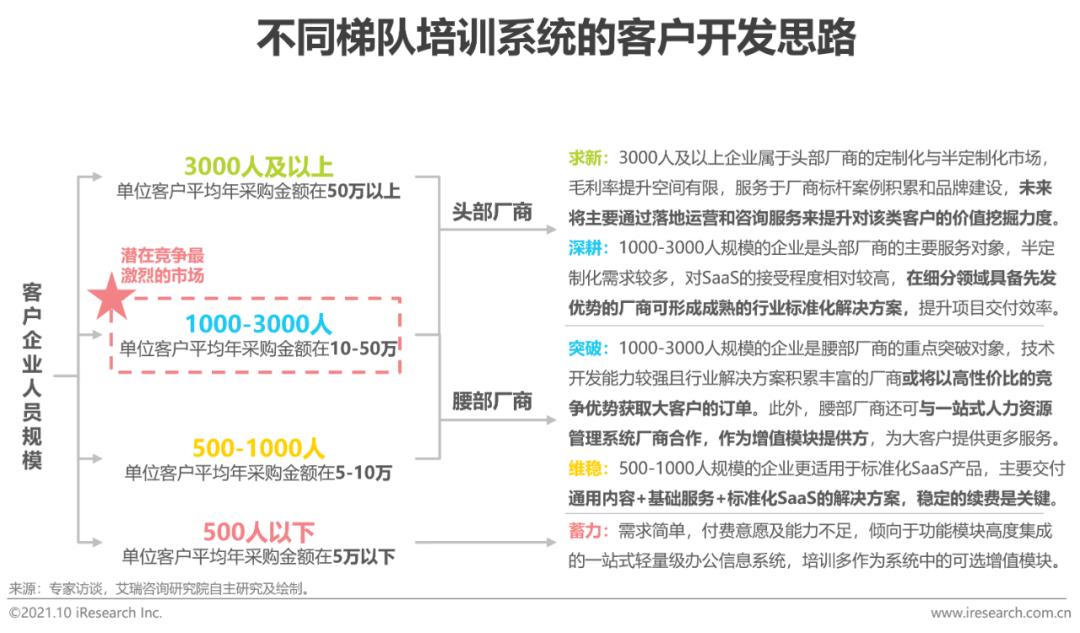 目前,主流培训系统厂商的营收规模多在千万量级,其中,营收规模前5名的厂商均已通过深度服务千人及以上规模的企业,实现了亿元级别的营收,积累了丰富的标杆客户服务经验。在企业客户中,1000-3000人规模的企业仍然值得深度挖掘,这类客户更关注特定岗位的人才发展战略与组织绩效提升,所以对于培训系统厂商来说,打磨出一套成熟的一站式行业解决方案与岗位解决方案将成为其争夺这类客户的关键。此外,对于千人以下规模的企业而言,低价依旧是现阶段“破冰”的最佳方法,厂商有望通过“轻量级”与“工具化”的产品,打通企业其他业务模块,成为高频、刚性需求模块的被集成方,并基于自身的技术服务能力与平台运营能力,提升企业培训过程中资源对接、业务推进和项目实施的效率。