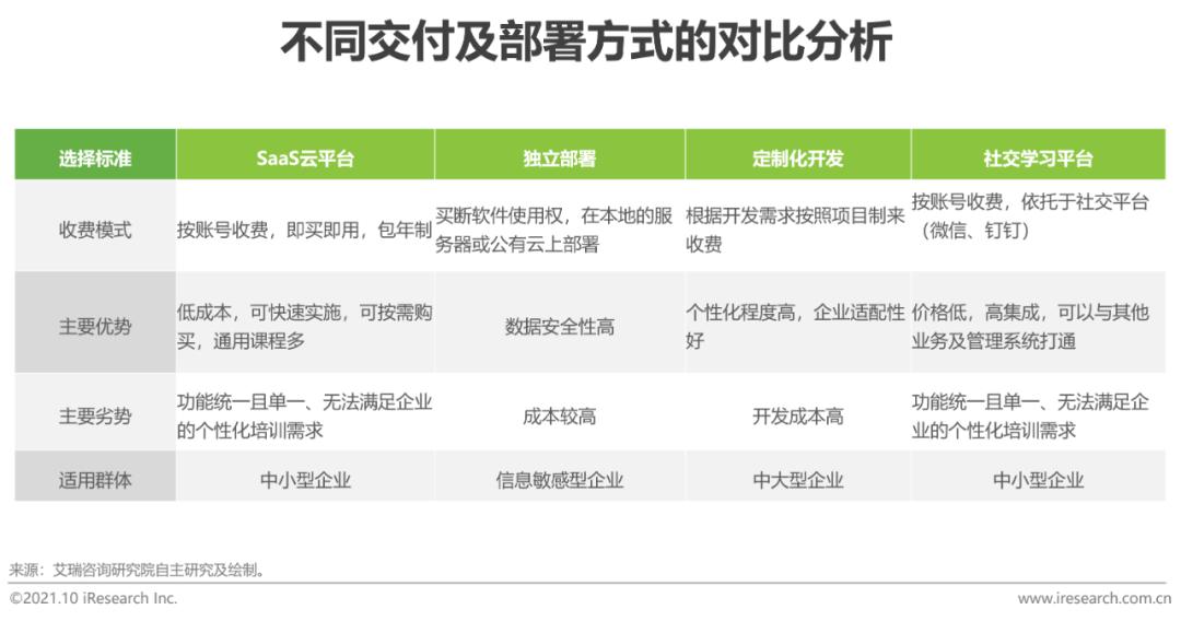 培训系统的平台体系主要由四个子系统组成,分别为学习管理系统(LMS)、知识管理系统(KMS)、虚拟教室系统(VCS)和在线考试系统(OES),不同系统在企业培训管理及实施过程中的主要功能不同,系统的稳定性与功能的易用性是培训系统搭建基础,随着新一代信息技术的落地,系统的智能化水平将逐渐提升。从交付及部署方式来看,可将培训系统分为SaaS云平台、独立部署、定制化开发和社交学习平台,不同的产品部署方式各有优劣,收费方式也不尽相同。在软件SaaS化和社区学习的趋势之下,企业对SaaS云平台的接受程度逐渐提升,基于社交软件的学习平台也有助于企业实现培训系统多端联动与学习数据互相联通。未来,平台将进一步开放,与其他管理系统及业务系统打通,在统一的账号体系下,实现业务数据与学习数据的关联,构建“密联业务,业培一体”的生态闭环。