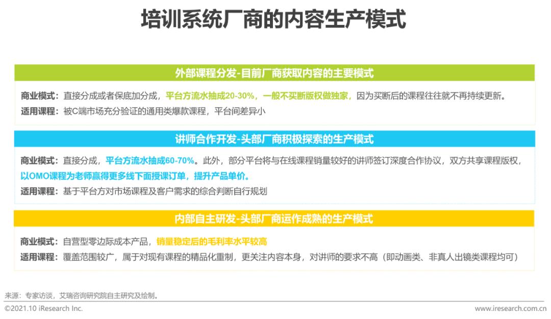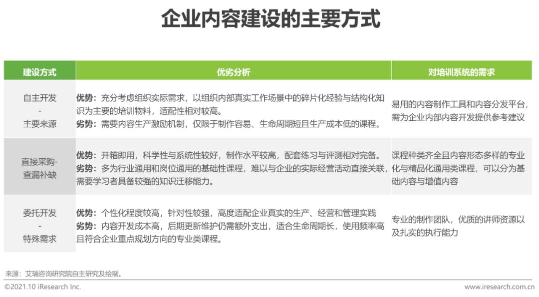内容:构建资源壁垒,优化制作工具,精进制作能力企业内容建设方式主要分为自主开发、直接采购和委托开发,不同的建设方式适用于开发不同类型的课程,也需要培训系统提供不同的工具、产品及服务,随着企业越来越重视内容的适配性,在功能丰富又操作简易的内容制作工具的帮助下,自主开发的内容将成为内容体系的主要组成部分。从培训系统的角度来看,可持续的优质内容供给能力是厂商建立差异化竞争优势的基础,这关乎厂商的选品能力和研发能力,归根结底是一种质量控制能力。短期来看,与众多第三方内容厂商合作能够迅速提升课程商城的容量,让企业有更多选择;但长期来看,厂商不仅需要为企业提供一揽子精品化课程组合,降低企业的采购决策成本,还需夯实自身的课程研发能力,联合师资端资源,提供混合式的课程交付,丰富课程交付形态。