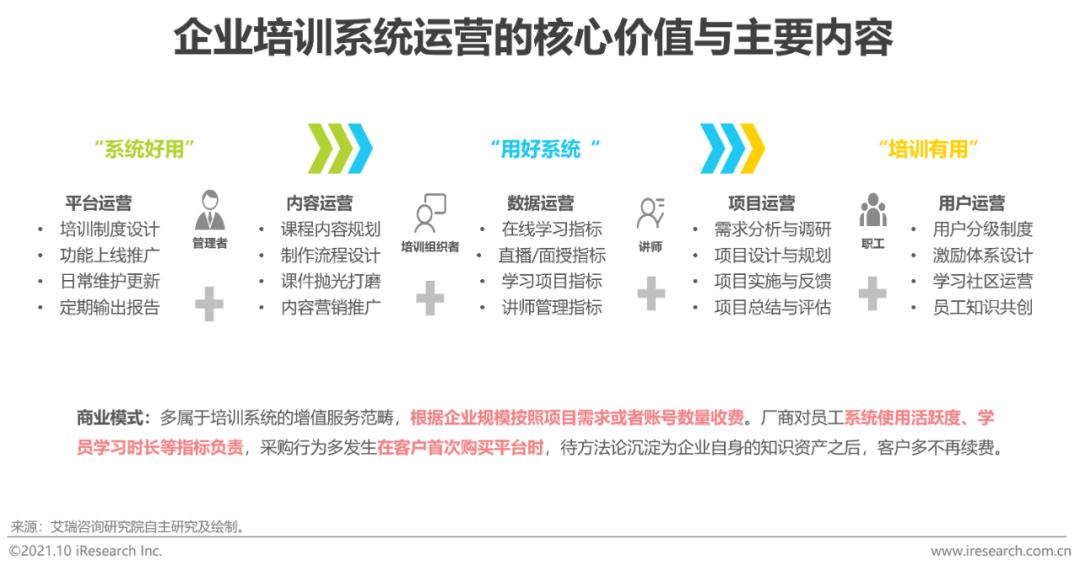 运营:落地实施细节,助力客户用好产品,最大化产品价值培训运营是企业开展培训活动的重要环节,需要企业组织者对各个落地实施动作进行不同程度的细化。在传统培训场景下,由于缺乏必要的管理系统和工具平台,培训运营的效率低下,最终的运营效果往往也不及预期,基于此,培训系统的数字化运营管理体系应运而生。另外,运营具有很强的“服务属性”,更关注于企业培训过程中,各个参与方对培训系统中平台和内容的使用,进一步说,平台和内容的迭代会让培训系统越来越“好用”,而运营则是让客户“用好”培训系统,实现产品价值最大化,让培训“有用”。具体来看,基于培训系统的运营可根据运营对象分为平台运营、内容运营、项目运营(包括活动运营、赛事运营和直播运营)、用户运营(包括社群运营和媒体运营)和数据运营,不同运营活动的目标不同。首先,在数字化运营的思路下,数据运营的可行性和重要性显著提升,且几乎贯穿于各个运营活动的始终。其次,围绕学习者的用户运营和项目运营完美诠释了“以学习者为中心”的培训设计理念,让学习者以更积极的心态在平台中消费内容,并获得更丰富的学习体验。最后,平台运营和内容运营则更是使用说明书式的落地方法论,便于各个参与方对平台及内容进行日常管理与更新维护。