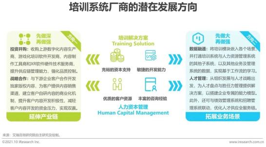 “先做深,后做强”与“先做大,后做强”是培训厂商未来可能出现的两个发展方向。一方面,对于一些资本充裕的厂商而言,可通过向产业链上游投资并购内容及技术服务商的方式,构建独家内容版权的竞争壁垒,提升精品化内容的生产效率及制作能力,将来自企业外部的资本支持转化为来自企业内部的资源壁垒,形成长效竞争优势。此外,为提升企业内容开发质量,激发企业内容开发积极性,减轻企业内部课程开发的资金压力,厂商可与企业联合开发独家版权课程,并通过厂商自己的课程商城内向其他企业销售,为客户企业及厂商创造额外的收入。另一方面,对于在人力资源管理与人才技术开发上具备领先优势的厂商而言,可通过将培训模块组件化的方式与企业其他业务及管理系统集成,提升产品的工具价值,打通不同业务及管理场景的数据,实现基于工作流的学习与培训,提升学习成果转化效率。此外,对于在数字化学习项目落地经验丰富,一体化人才发展战略咨询能力成熟的厂商而言,可基于企业人力资源数据资产,优化人才供应全服务链条。