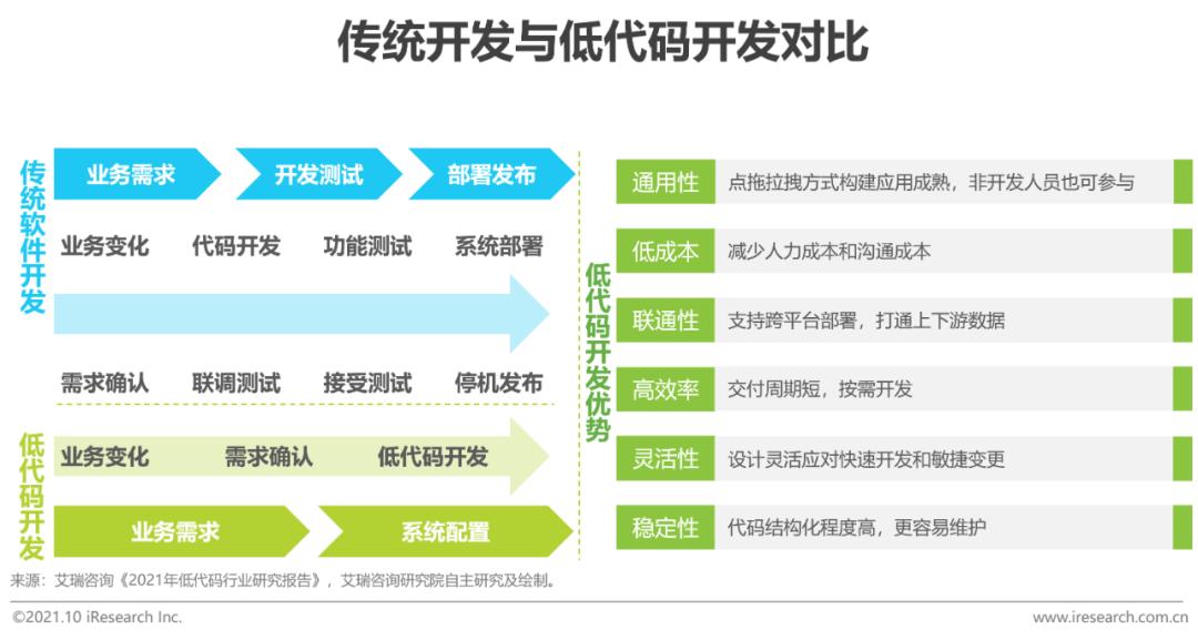 从培训系统的角度来看,在可以预见的一段时期内,千人及以上规模的企业依旧是核心客群,但标准化SaaS产品的配置能力尚不足以满足这类客户深度个性化的需求,厂商二次开发的现象普遍,这不仅提升了开发成本,还对后续产品迭代及业务融合提出了新的要求,不利于厂商及客户的可持续发展。从软件开发的演进趋势来看,人类无不朝着降低应用开发门槛与提升开发效率的方向发展,开发者也不断地以不同的路径尝试着易复用、易理解、易分工的开发方式,满足企业管理者对于敏捷开发的需求,以实现快速响应客户、快速调整组织架构、如何快速试错与快速迭代。基于此,低/无代码PaaS平台或将成为新一代中大型企业的软件开发模式,减轻客户对专业工程师的依赖,让业务部门用拖拽的方式自行搭建应用平台,满足业务部门个性化需求,降低人力成本,减少与IT部门反复沟通的流程,缩短项目整体开发周期。
