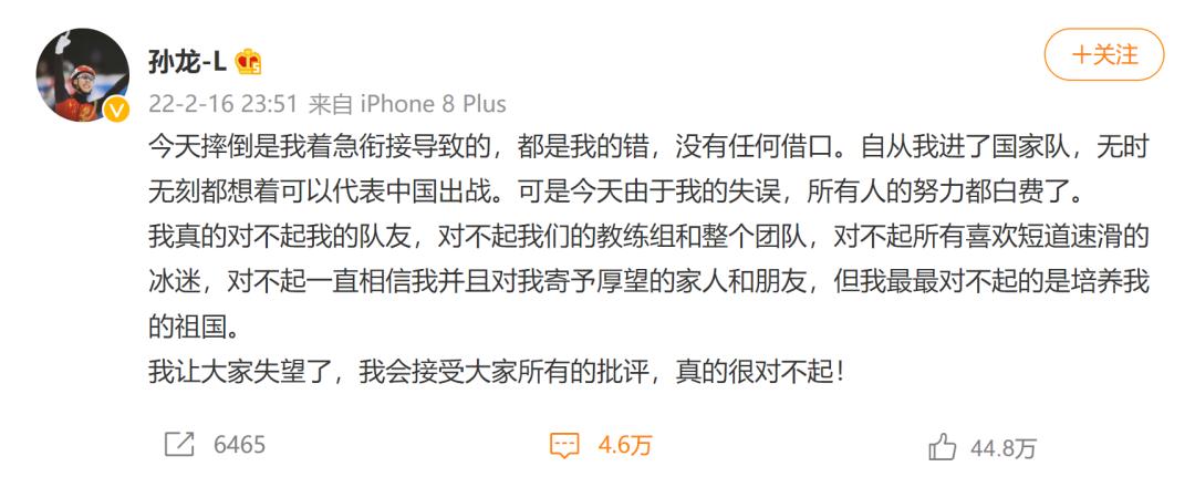 孙龙用6个“对不起”致歉,他表示:今天摔倒是我着急衔接导致的,都是我的错,没有任何借口。自从我进了国家队,无时无刻都想着可以代表中国出战。可是今天由于我的失误,所有人的努力都白费了。