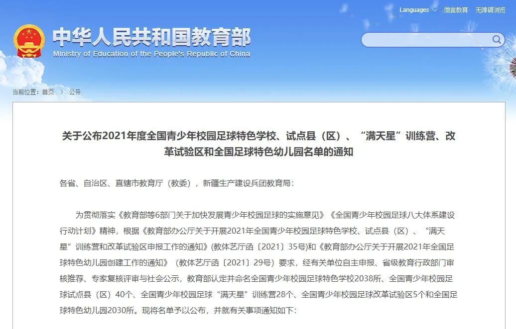 为贯彻落实《教育部等6部门关于加快发展青少年校园足球的实施意见》《全国青少年校园足球八大体系建设行动计划》精神,教育部认定并命名全国青少年校园足球特色学校2038所、全国青少年校园足球试点县(区)40个、全国青少年校园足球“满天星”训练营28个、全国青少年校园足球改革试验区5个和全国足球特色幼儿园2030所。