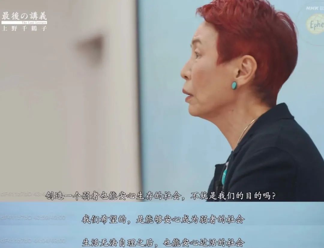 上野千鹤子的答案是,“成为弱者的时候,可以毫不顾忌地说出,‘请帮帮我吧’,而且求助的时候,还能够得到他人的帮助。创造一个弱者也能生存的社会,就是我们的目的。”