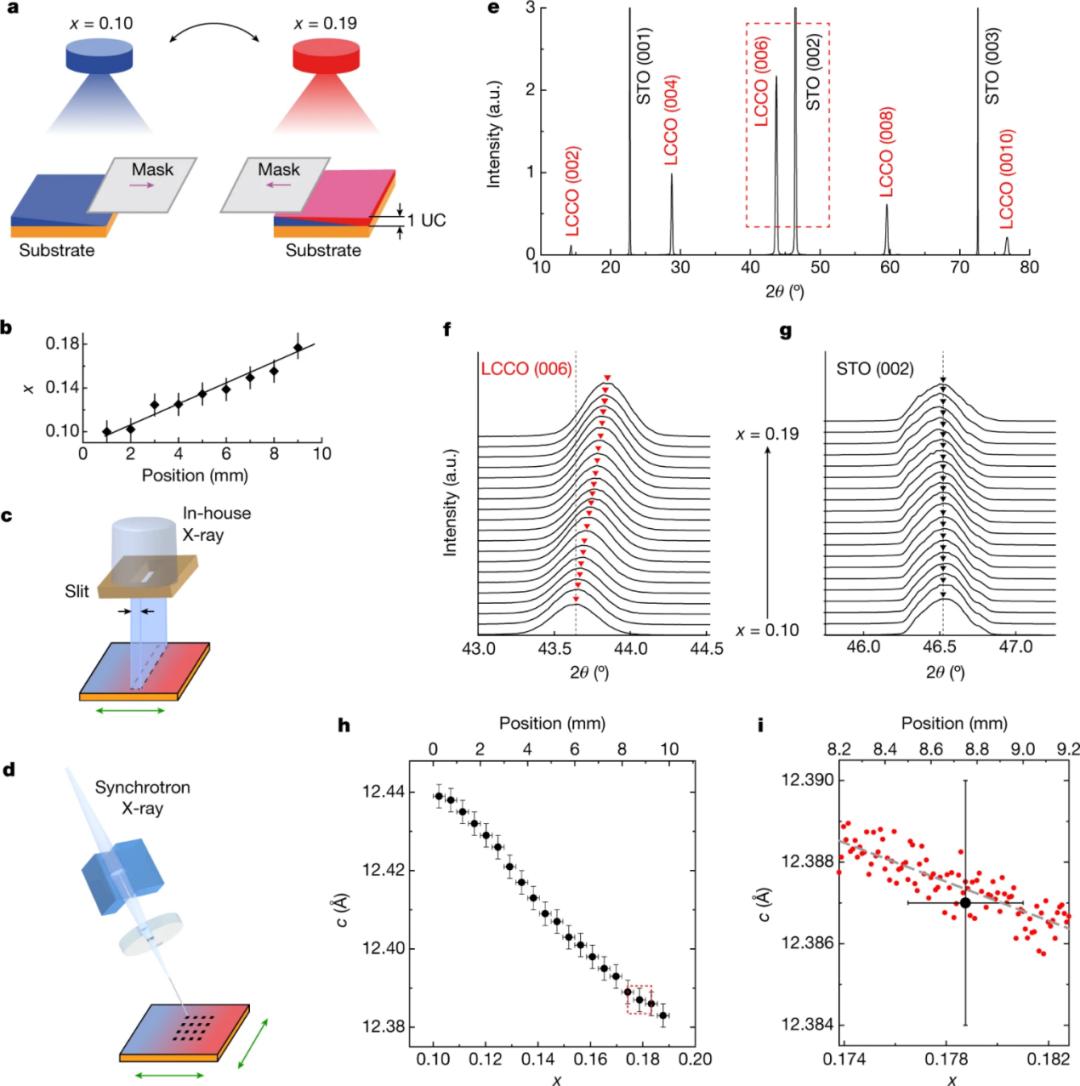 2017 年,团队首次利用组合激光分子束外延技术在1平方厘米单晶衬底上成功制备出沿一个方向具有连续化学组分梯度的单一取向LCCO高通量薄膜[7],其两端组分分别对应于最佳超导掺杂和费米液体金属。