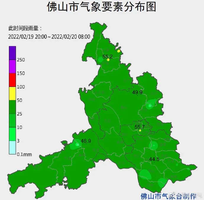 佛山各区寒冷橙色预警信号已生效2月19日20时至20日8时,佛山出现大雨、局部暴雨,全市平均降雨量35.4毫米,各区最大累积雨量(单位:毫米):禅城石湾55.7,南海狮山49.9,顺德勒流44.5,高明荷城46.9,三水芦苞55.2。
