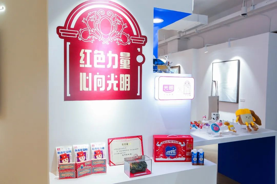 随着步履的律动,“红色力量,心向光明”的红色牌匾吸引住了大家的视线。光明乳业携手一大文创跨界推出的红色文创产品——光明小红砖、新青年雪糕、光明优加益固牛奶红色文创限定版,向青年人传递红色力量,开启舌尖的红色之旅。