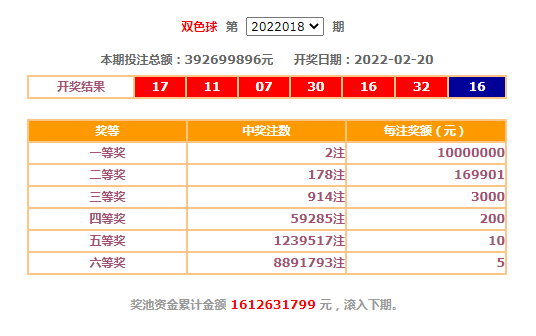 2月20日晚,中国福利彩票双色球游戏进行第2022018期开奖,红球号码为07、11、16、17、30、32,蓝球号码为16。