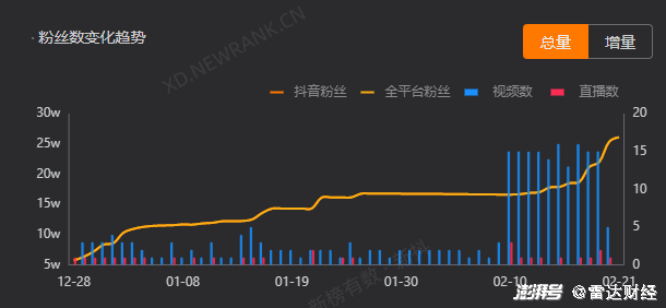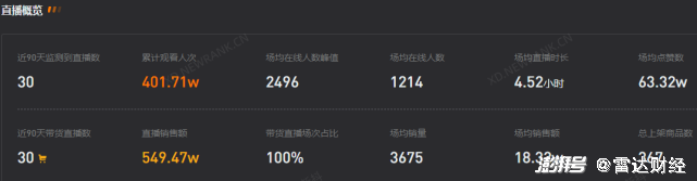 据新抖数据显示,自2021年12月28日新东方“东方甄选”开始带货以来,截至2月20日,该品牌带货直播30次,累计观看人次401.71万,累计直播销售额549.47万;场均在线人数1214、场均直播时长4.52小时;场均销量3675件、场均销售额18.32万;总上架商品数367个。