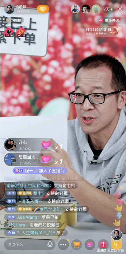 据媒体报道,去年11月7日,俞敏洪在抖音开启了首次直播,他透露,新东方计划成立大型农业平台,将和新东方的老师们一起进行助农直播。