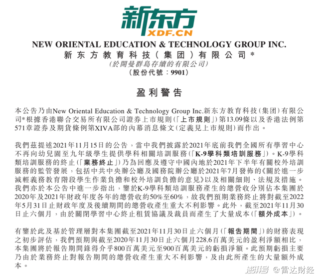 1月21日,新东方公告,预期集团截至2021年11月30日止6个月,录得8亿美元至9亿美元的亏损净额,主要由于业务终止对报告期间的总营收产生重大不利影响。