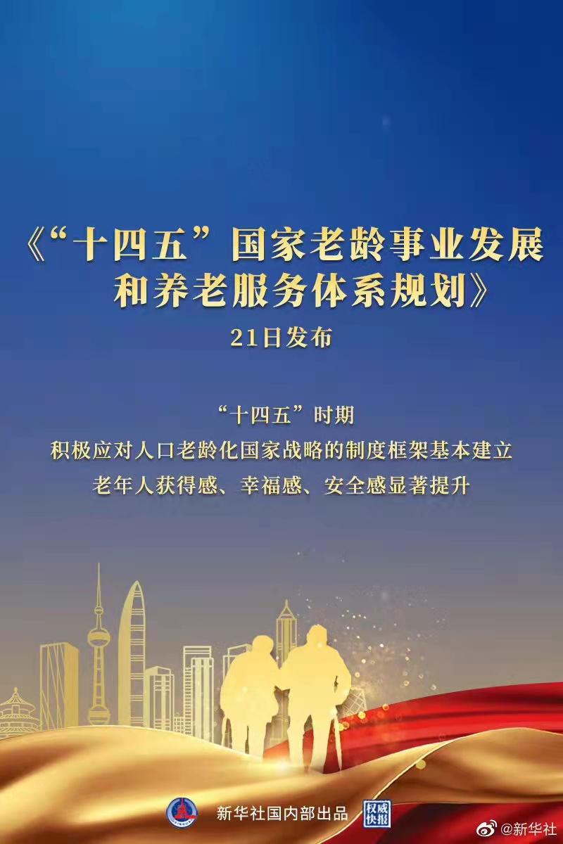 热点资讯▲为贯彻落实积极应对人口老龄化国家战略,国务院日前印发《“十四五”国家老龄事业发展和养老服务体系规划》,围绕推动老龄事业和产业协同发展、推动养老服务体系高质量发展,明确了“十四五”时期的总体要求、主要目标和工作任务。其中明确要尽快实现企业职工基本养老保险全国统筹;实施渐进式延迟法定退休年龄;扩大老年人慢性病用药报销范围等。