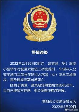 ▲据贵阳交警通报,2月20日0时许,谭某峣(男)驾驶小型轿车行驶至云岩区三桥南路时,车辆冲入公交车站与正在候车的行人宋某(女)发生交通事故,事故造成宋某当场死亡。经初步调查,谭某峣涉嫌酒后驾驶机动车,目前已被警方控制,相关调查正有序开展。