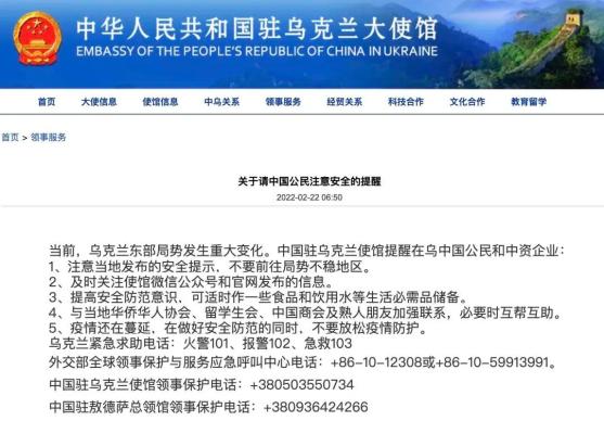 22日,中国驻乌克兰使馆发布提醒,提醒在乌中国公民和中资企业: