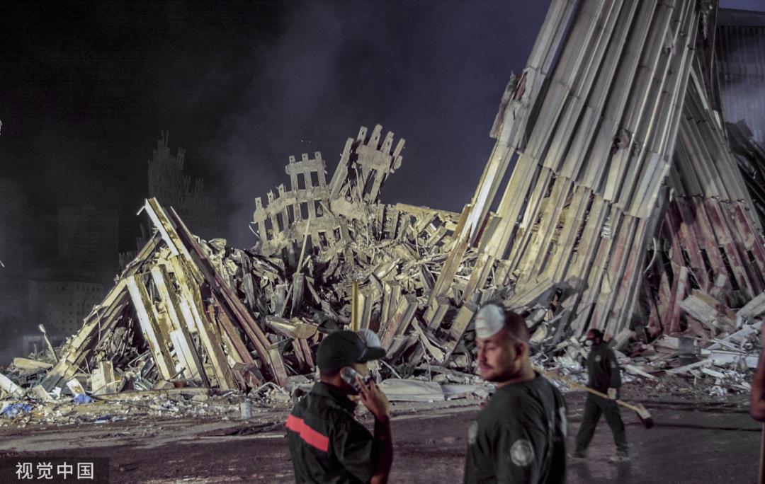 美国纽约,救援人员在双子塔废墟中进行清理工作。图|视觉中国“9·11”事件在美国历史上占据重要地位,是美国当代史的转折点,也是美国自珍珠港事件以来不可触碰的民族伤痛。